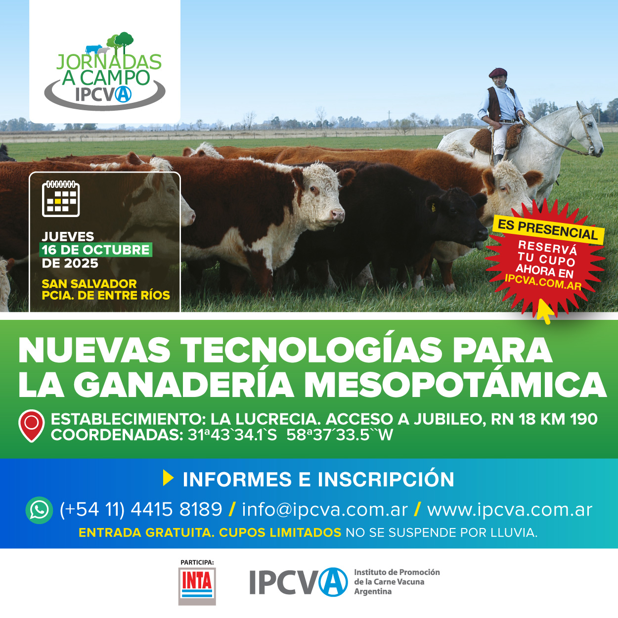 Bajo el slogan “Nuevas tecnologías para la ganadería mesopotámica”, el Instituto de Promoción de la Carne Vacuna Argentina (IPCVA) llevará a cabo una nueva Jornada a Campo en el Establecimiento La Lucrecia de San Salvador, Provincia de Entre Ríos (Acceso a Jubileo, Ruta Nacional 18 Km 190) el próximo jueves 16 de octubre de 2025.